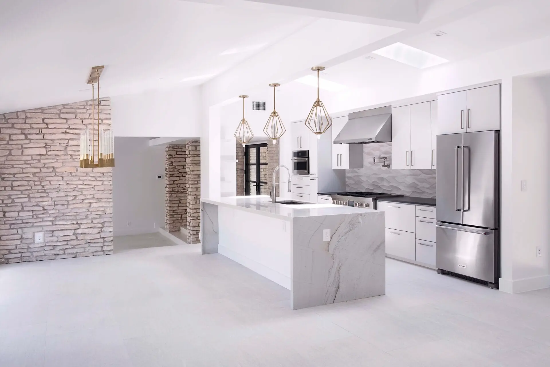 Modern kitchen island in Mont Lucia quartzite with mitered waterfall edges. Kitchen design by Messer Design+Construction
